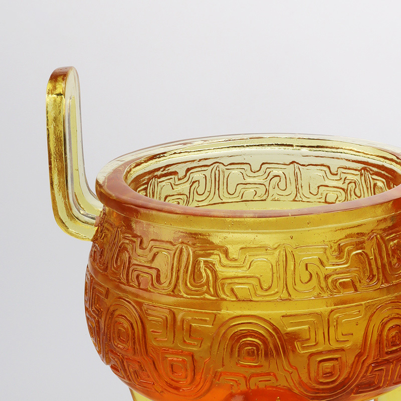 Z hľadiska dizajnu je tvar glazúrovaného statívu slávnostný a jednoduchý, želateľne kopíruje klasický tvar starovekého statívu. Na tele statívu sú nádherné rezbárske práce, uši sú prirodzene zakrivené a línie na tele statívu sú jemné a vrstvené, akoby rozprávali dávny príbeh. Trojnohý tvar statívu je jedinečný, predstavuje stabilný a atmosférický postoj a každý detail ukazuje vynikajúcu remeselnú zručnosť remeselníkov.